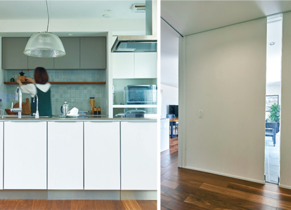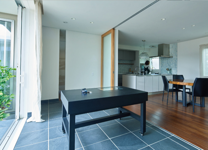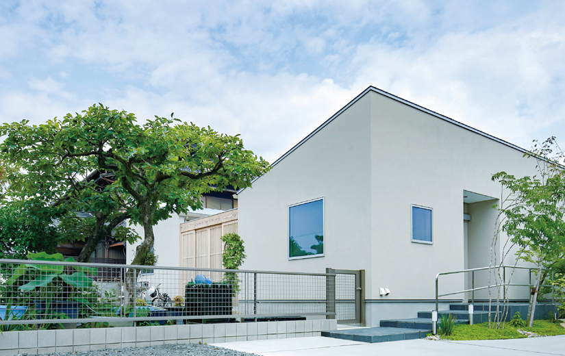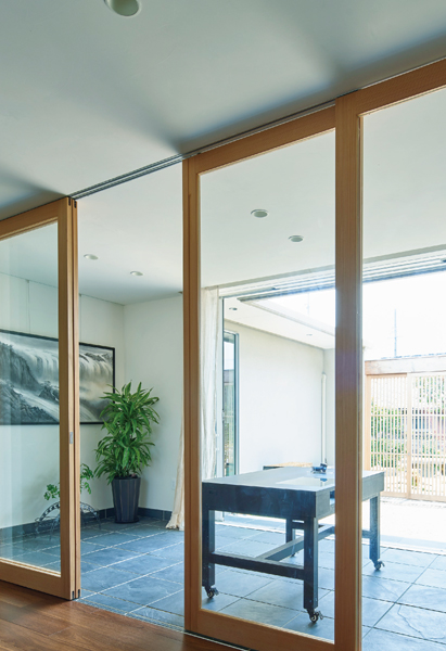 当初はリノベーションを検討されていたM様。調査によって白アリ被害がわかり、思い切って築50年の母屋を建て替えることになりました。生まれ変わった家は、中庭を囲んだコートハウス(中庭のある家)。外庭と中庭を隔てる和風の格子戸と、塗り壁で仕上げた外壁のホワイトカラーが、上質さを醸し出しています。居住空間は中庭を囲んでコの字型にデザイン。インナーテラスとダイニングは、ハイドア(背の高い引き戸)を開放すれば中庭とつながるオープン空間に。インナーテラスにはガラスの引き込み建具を使用しており、閉め切っていてもダイニングから中庭への視線を遮ることがありません。普段は別々に暮らすご家族が週末に揃ってバーベキューを楽しんだり、週末にはお孫さんが客間に宿泊されたり、集いの機会を広げる住まいになりました。