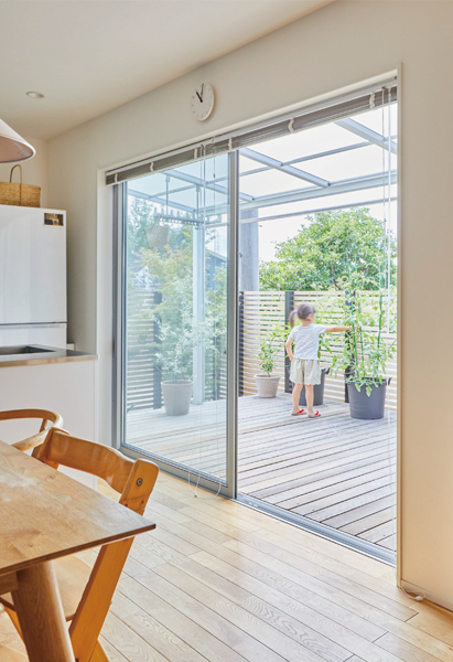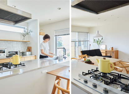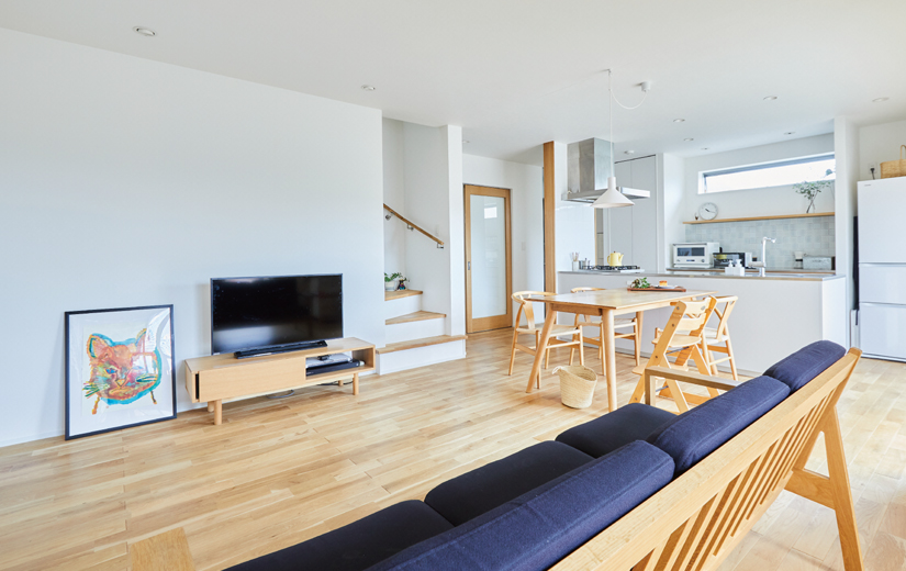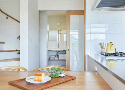 奥様がふとおっしゃった、「そっけないくらいが、ちょうどいい」という一言。その言葉をキーワードとしてリノベーションを進めました。目指したのは、シンプルな使い勝手と飽きの来ないクオリティ。二人のお子様はまだご両親が目を配っていたい年齢でもあり、ダイニングキッチンとリビングの仕切り壁を取り払って家族がひとつにつながる空間に改装しました。キッチン横には、お子様の遊び場にもなるウッドデッキを配置。水回りとストレートにつながる配置で目が届きやすく、家事効率も抜群です。玄関脇には、キッチン直通の引き戸を設置しました。お買い物後の重い荷物運びやゴミ出しがスムーズです。リビングから2階の子ども部屋へつながる階段は、家族の気配を感じられる配置に。らせん階段が空間のアクセントにもなっています。