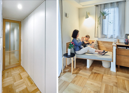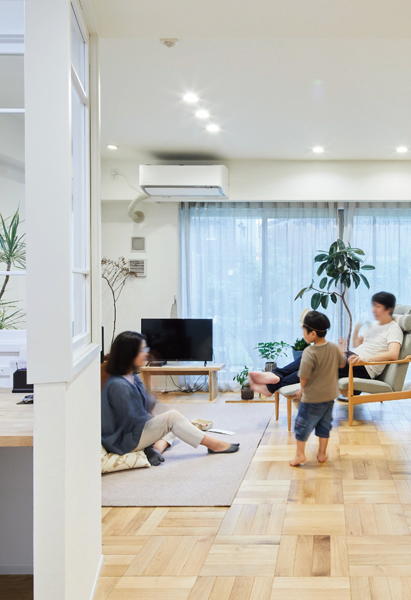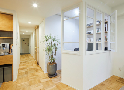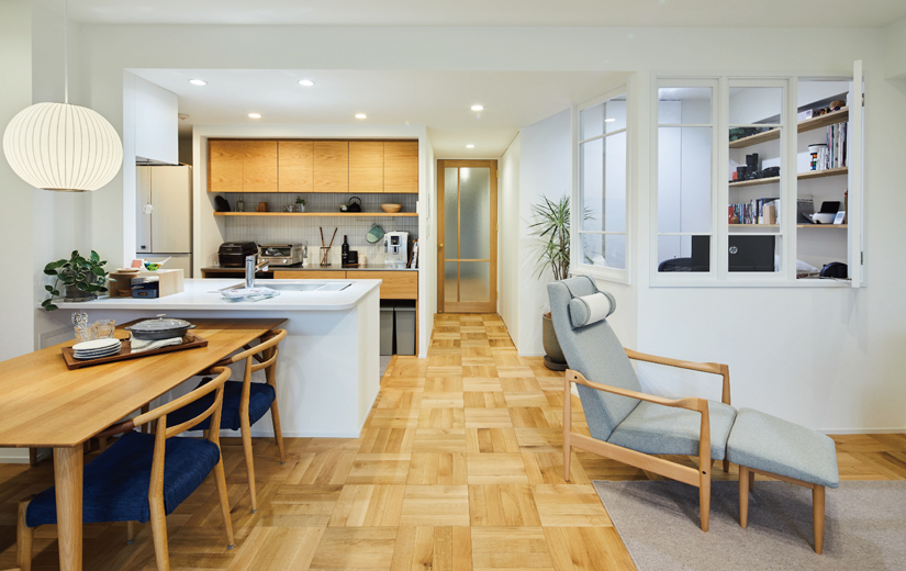贅沢ではないけれどシンプルでナチュラル、暮らしやすい住まいを。施主様のそんな思いを汲み取った中古マンションリノベーションの事例です。全体のイメージを決めているのは、LDKのフローリング。マンションリノベーションを望まれた大きな理由が、この無垢材フローリングへの変更でした。オークパーケット材ならではの木目と質感が、空間に柔らかいニュアンスを与えています。ダイニングスペースの一角には、奥様のご希望のひとつであるヌックスペースを新設。オリジナルで造作しており、座面の固さや生地の確認を何度も行って完成しました。リビングのドアに採用した半透明のガラスと格子は、ふんわりとしたやさしい空気感を生み出しています。収納スペースをたっぷりと確保していることも特徴的です。本がお好きなご家族のために廊下に本棚兼用収納を設置しました。来客時などには扉を閉めておくことができます。玄関クロークは居室を縮小してスペースを確保。通風にも配慮しており、居心地にフォーカスしたマンション空間となりました。