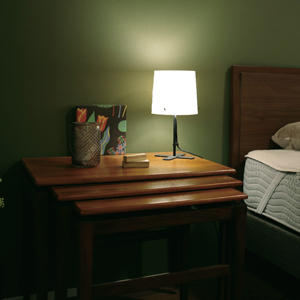 寝室の一面だけをモスグリーンのクロスで仕上げました。後から新調された素敵なネストテーブルとの相乗効果で、落ち着いたインテリア空間が完成しました。