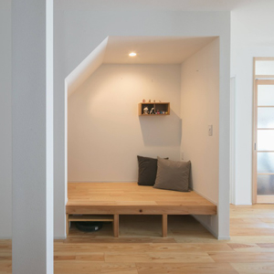 リビングの壁面に当たる階段下のスペースに、ヌックをしつらえました。読書や休憩など一人の時間を楽しみながら、リビングにいる家族ともゆるやかにつながることのできる空間です。